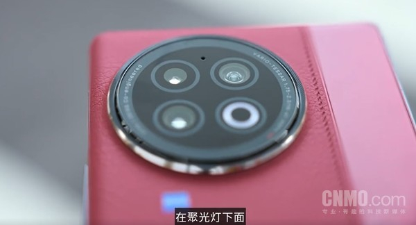 背面摄像头模组沿用了vivo经典的“天圆地方”式的镜头组设计。内含超广角、广角和人像三颗摄像头,分别支持0.6倍、1倍和2倍变焦。摄像头周围的装饰圈上刻了一圈放射形的纹路,在聚光灯下看起来极具未来感。