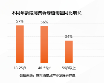 对于生活节奏快、注重生活品质的白领来说,一个小巧别致的绿植,一抹生机勃勃的绿色也让人在紧张的工作之余多了轻松与自在的气息。京东销售情况显示,2023年前3个月,城市白领最爱买盆栽绿植,销量占比34%;学生群体网购绿植的销量占比22%。白领们购买“懒人”、“自动吸水盆”盆栽的销量占比较高,销量占比分别为36%、37%;学生购买防辐射绿植的销量占比较高,占比为28%。从年龄角度看,00后网购家养植物销量同比增长57%,是不同年龄段城市绿植消费增长最高的人群。