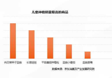 * 种植技能从娃娃抓起。儿童种植盆栽销量同比增长207%,销量最高的商品是向日葵种子盆栽、长草娃娃、平菇蘑菇种植包。种植对于儿童教育的意义和价值已被广泛认可,很多小学还会给学生们发放绿植盆栽、布置种植作业,引导儿童每天观察植物的生长状态、摸一摸叶片、描述一下自己的感受等等。儿童种植不仅让儿童深入的了解自然知识,丰富课外活动,还能体验劳动和收获果实的快乐。