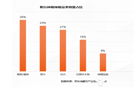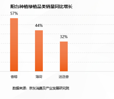 对城市消费者来说,在阳台上种绿植的情况更多。京东销售情况显示,在适合阳台种植的绿植品类中,有人在阳台上种花,有人在阳台上植树,但人们买的最多的是蔬菜和菌类。在阳台上种菜,可以像养花一样,观其形、闻其香,需要的时候摘几片还能品其味,体验“采菊东篱下”的乐趣和意味。