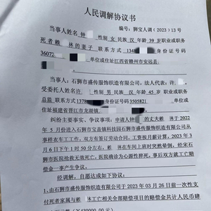 在赖先生提供的人民调解协议书上,红星新闻记者看到,赖某林妻子与石狮市盛传服饰织造有限公司产生纠纷的主要事实为:赖某林于2022年5月进入该公司从事样衣车工工作,双方有签订劳动合同,工资按月薪计算,2023年3月6日下午1时50分左右,赖某林在车间上班时突然晕倒,经送石狮市医院抢救无效死亡,医院确诊为心源性猝死,事后双方就工亡赔偿金一事产生争议。