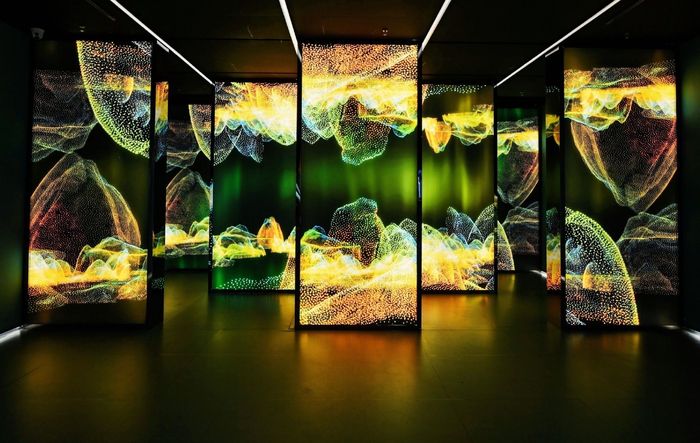 而在东大路站的C1或C2口脚步一转,眼前豁然开朗,幕墙上蓝、绿、黄交织形成的“山水画”带来些许科幻色彩,这就是由成都凤凰数字艺术中心东大路馆首展的《画游千里江山——故宫沉浸艺术展》。