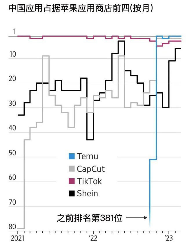 “中国应用为何成了美国年轻人的最爱?”《华尔街日报》日前以此为题刊发了一篇报道。文中称,今年3月份的前三周,美国应用商店中App下载量Top5,4家来自中国企业,这其中,上线七个月的拼多多跨境电商平台Temu登顶,紧随其后的是海外版剪映CapCut和正在风口浪尖的TikTok,跨境快时尚零售商Shein排在第四位,Facebook是前五中唯一的非中国应用。