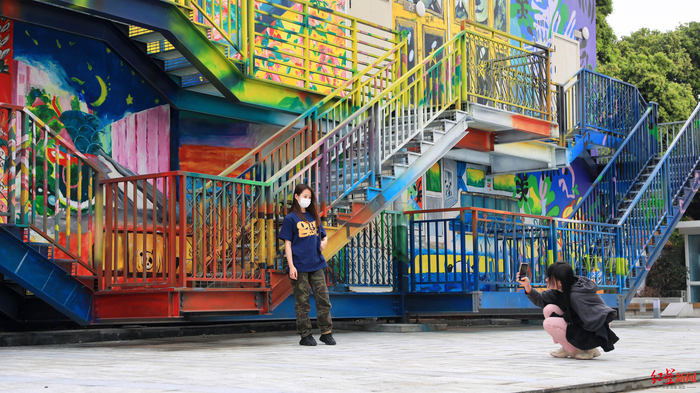 4月的第一天,温暖的阳光洒在身上,很舒服。在成都音乐坊的一角,很多人被眼前的一栋“建筑物”吸引:三层高的建筑,墙面肆意挥洒着颜料。有憨态可掬的熊猫,有野蛮生长的红花绿叶……