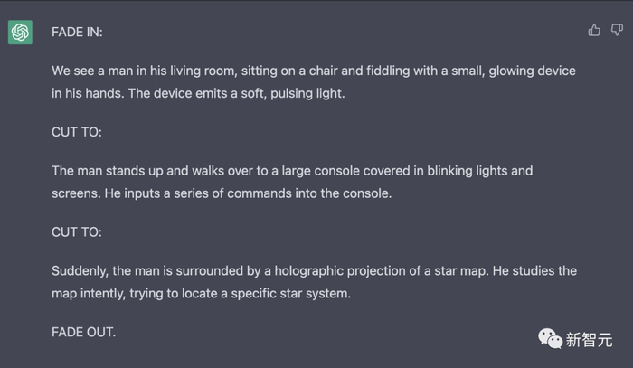 首先,对ChatGPT说:「给我写一个脚本,生成一个由三个3秒剪辑组成的9秒视频。这个故事是,一个男人在他的客厅里,要以科幻为主题。」