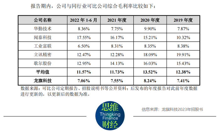 但新的问题随之而来,伴随着关联方在企业中的话语权不断加重,龙旗科技的综合毛利率呈现不断下滑且处于行业底部的情况。根据最新招股书,2019年至2022上半年,龙旗科技的综合毛利率分别为7.41%、8.24%、7.55%和7.06%。同时根据招股书中对同行业可比公司毛利率情况的所示,2019年至2022年上半年,同业公司平均综合毛利率为12.38%、13.52%、11.73%和11.57%。龙旗科技的综合毛利率明显低于平均值,对此公司在招股书中解释称主要因规模效应优势尚未完全体现。