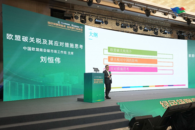 中国欧盟商会碳市场工作组主席刘恒伟在会上介绍了欧盟碳关税政策及对中国的影响,并从专业角度提出了应对措施思考。