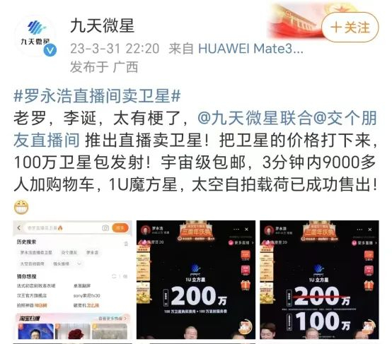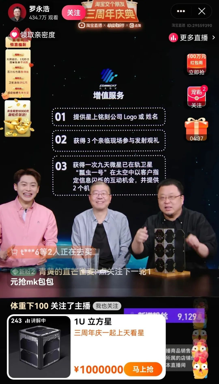 2020年,直播电商规模与流量以空前速度增长。当时深陷债务危机的罗永浩被一份调研报告说服,从此加入直播带货赛道,也为这个行业的话题度适时添了把火。2023年4月1日,罗永浩和其背后机构交个朋友,正式迎来开播三周年。几天的造势过后,3月31日晚,“罗永浩”淘宝直播间正式上架了几款价值从200万-3000万不等的国产商用卫星。据淘宝直播,截至4月1日凌晨2点,该场直播单场累计销售额超过1.2亿,创造罗永浩直播间历史最好成绩,订单峰值再创新高,商品累计曝光超过1亿,全场吸引超过780万人次观看。其中,一款售价200多万元的卫星链接上架后,累计9735人加购,六分钟后成交。此外,据《天下网商》了解,一名神秘的新加坡买家也在直播前于卫星公司的淘宝店支付了定金,拍下了300万的太空载荷。