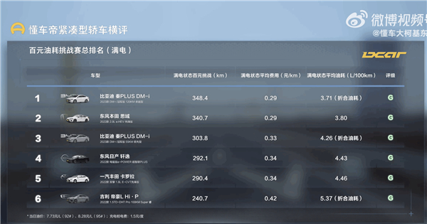 本田思域混动最终行驶了340.3km,拿下第二名;至于冠军比亚迪秦Plus DM-i高配,100块钱的油满电状态下行驶了348.4km,平均费用0.29元/km,折合平均油耗3.71L/100km。
