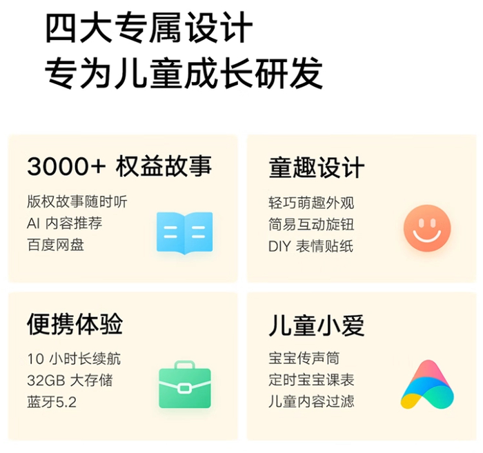 据了解,小米小爱音箱儿童版内含丰富版权内容,故事、英语、知识等启蒙熏听,支持离线播放、网盘应用,适应儿童使用场景。内置小爱同学儿童版,幼儿交互更畅快。