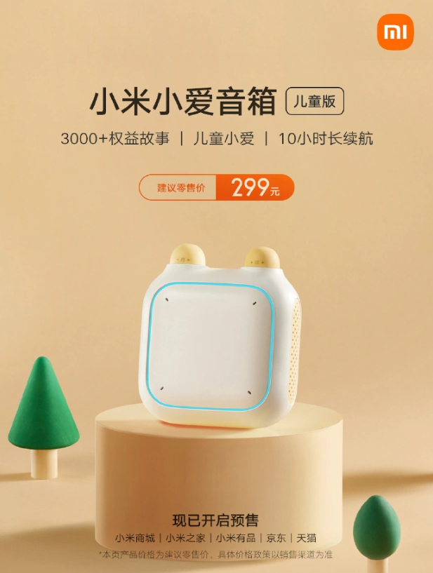 4 月 3 日消息,据小米智能生态官微消息,小米小爱音箱儿童版已经开启预售,这是小米首款专为 3-6 岁儿童设计的智能音箱,零售价 299 元。
