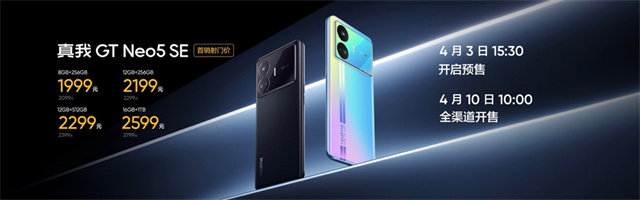 4月3日15:30,真我GT Neo5 SE在真我realme商城、京东、天猫等平台正式开启预售,首销射门价8GB+256GB版本仅需1999元,12 GB +256GB版本2199元,12 GB +512GB版本2299元,16 GB +1TB版本2599元,其中8GB+256GB的版本将在京东平台、真我realme官方商城开售。参与真我GT Neo5 SE预购可享受6期分期免息、30天无忧退换,并且赠送1年延保、1年碎屏保以及价值1400元的游戏礼包,4月10日全渠道正式开售。