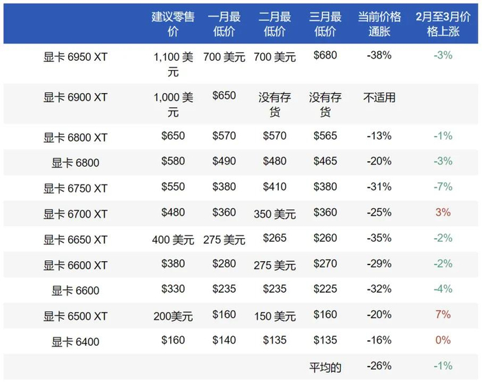 AMD Radeon 6600 系列 GPU 的价格继续略有下降,但并非所有型号都如此。Radeon 6950 XT 跌至 680 美元的新低,比上个月下跌 20 美元。我们还看到 Radeon 6650 XT 等显卡的历史低价回归,达到 260 美元。但与英伟达显卡一样,大多数型号在定价方面都相对稳定。