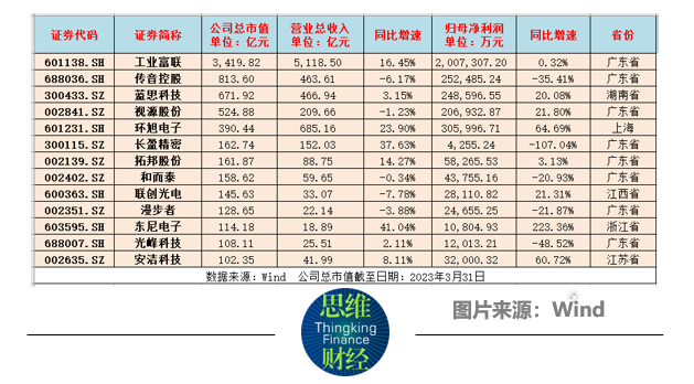 工业富联和立讯精密;市值500亿元-1000亿元的公司有4家,分别是传音控股、歌尔股份、蓝思科技和视源股份;市值100亿元-500亿元的公司有15家,包括领益智造、环旭电子、安克创新等。