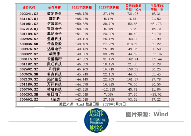 同时, 2022年股价跌幅在40%-50%之间消费电子公司超过20个,其中不乏传音控股、安克创新、长盈精密等市值过百亿元的公司。