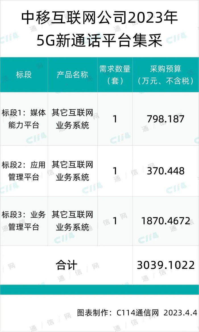 C114讯 4月4日消息(焦焦)从中国移动官网获悉,中移互联网公司日前发布公告称,2023年5G新通话平台公开比选项目已具备采购条件,现进行公开比选,具有服务能力的供应商均可前来报名。