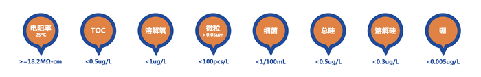 半导体行业对超纯水的指标要求比其他行业都高 。根据半导体芯片的大小和线径的不同,水质要求也不一样。其超纯水的水质指标如下:电阻率大于18.2兆欧(25摄氏度);TOC(总有机碳)小于1至10 ppb,DO(溶解氧)小于1至10 ppb;0.05微米颗粒(微粒)小于200个/升;离子含量大多小于20至50 PPT没有检测到细菌。