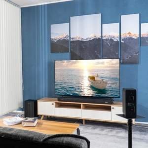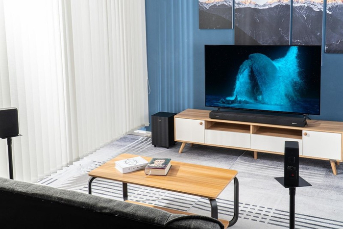 在安装方面,这套系统也提供了多种安装环境,你可以根据自己的需要选择将回音壁挂在墙上或者是直接摆在电视柜上;卫星箱部分也是如此,但是更加推荐壁挂式或者使用落地支架支撑在观影位两边,这样子可以让声音和主机搭配,电影声音环绕感更强,临场感拉满,但是落地支架需要单独购买,有需要可以再选购。