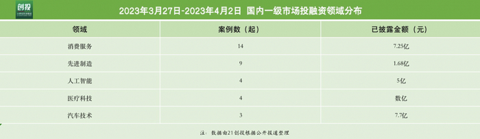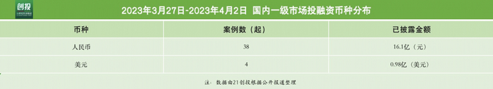 据21创投不完全统计,3月27日——4月2日,报告日期内国内一级市场发生融资事件38起,总规模超16.1亿元。