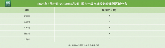 从披露获投企业的地域分布来看,主要集中在北京市、江苏省和广东省。分别为9、8和6起。