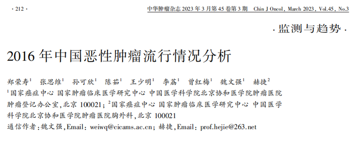 2023年3月22日,《中华肿瘤杂志》发表国家癌症中心、中国医学科学院肿瘤医院的重磅文章,公布(因为国家的癌症数据统计通常会延迟3~5年,所以这实际是2016年的癌症数据)中国恶性肿瘤流行数据,首次提供各省主要癌谱流行情况。