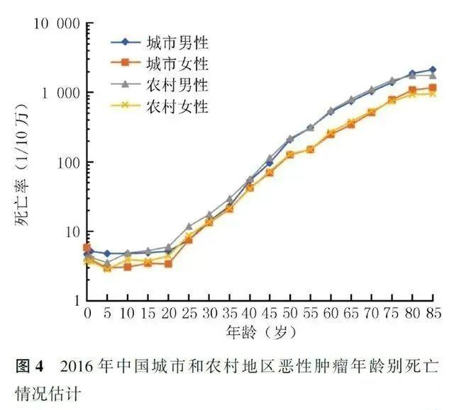 癌症发病率,农村略低于城市,但死亡率高于城市。城市以乳腺癌、结直肠癌等恶性肿瘤高发,农村以食管癌、胃癌、肝癌等消化系统肿瘤高发。