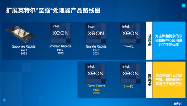 2024年会发布Sierra Forest、Granite Rapids代号的至强处理器,都使用Intel 3工艺,但架构不同,前者是E核架构,最多144核,后者则是继续P核高性能路线,核心数没公布,但性能预计很可观。