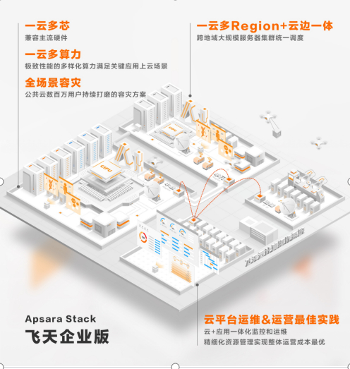 自2016年起,阿里云就推出面向专有云市场的飞天企业版(Apsara Stack),与公共云同根同源,经过多个版本迭代,目前可提供超80款云产品,支持多Region业务运行及跨域大数据计算,满足客户超大规模业务量运行需求。