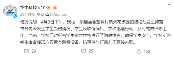 今日下午,华中科技大学官方微博就此事通报称,4月3日下午,该校一顶楼宿舍塑料材质天花板因扣板松动发生掉落,宿舍内未发生学生受伤情况。学生反映情况后,学校迅速行动,及时完成维修工作。