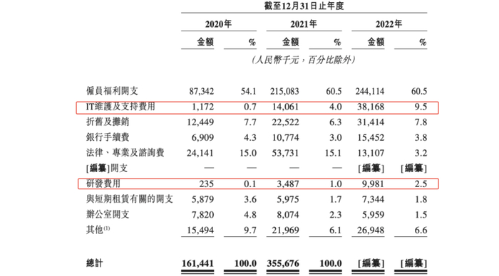 2021年是锅圈在数字化大手笔投入的一年。从招股书来看,锅圈2021年IT维护及支持费用、研发费用较于2020年均有10倍以上的提升,但同期整体行政开支费用约提升一倍左右。
