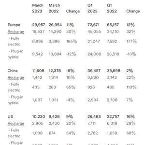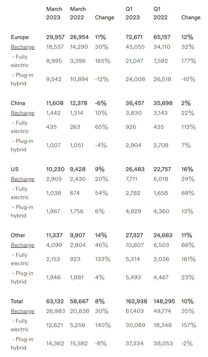 沃尔沃汽车官网显示,该公司 2023 年前三个月在欧洲的销量增长至 72,671 辆,同比增长 12%,新能源车型的份额达到该地区整体销量的 62%。今年前三个月,美国的销量增长了 16%,达到 26,483 辆,新能源车型占第一季度总销售额的 29%。