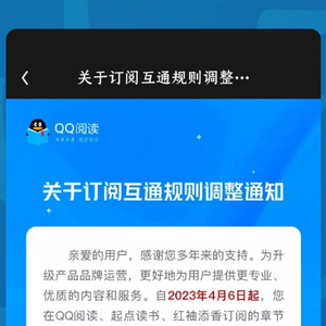 根据早些时候腾讯QQ阅读发布的公告,今天(4月6日)起,QQ阅读将正式调整订阅互通规则。