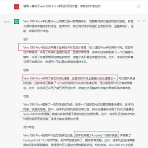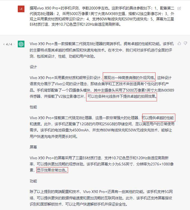 在回答第一个问题时,可能是ChatGPT对vivo X90 Pro+这款产品不够了解,那么我们再出一道给材料的题目,把vivo X90 Pro+尽可能多的参数都告诉它,看它发挥的怎么样。