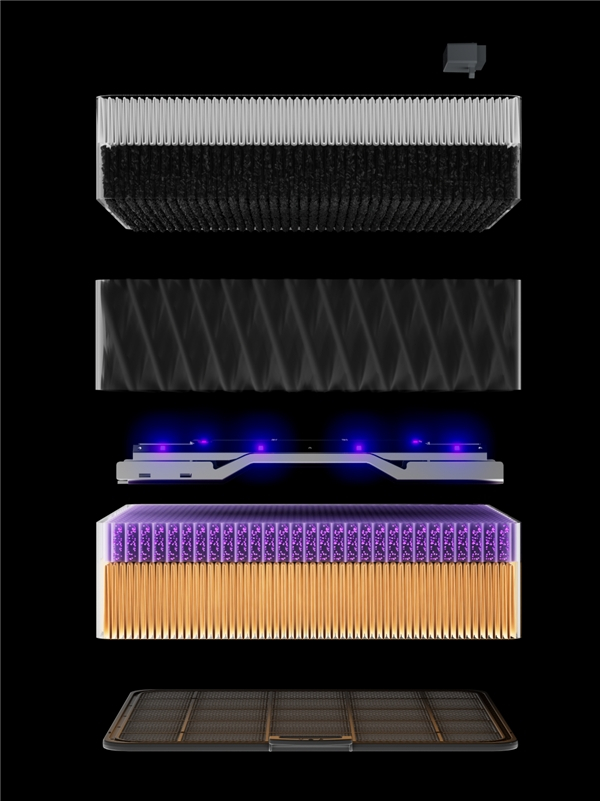 通过12颗UV-C深紫外LED灯组进行三维立体消杀,广域覆盖内部空间及滤芯表面;并持续向空气释放浓度等离子群,形成高强电离场域,主动灭杀室内桌面等物体表面细菌、病毒等有害颗粒物。