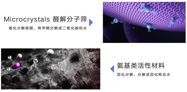 并通过氨基类活性材料反应+醛解分子筛,双效分解甲醛,彻底除醛,无二次污染。