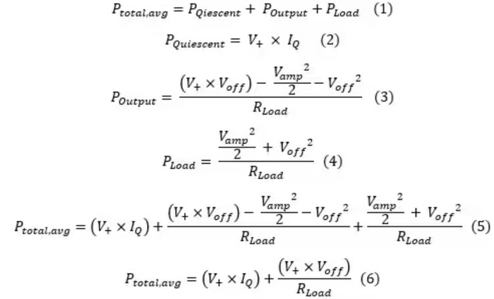 在本例中,我们有一个单电源运算放大器,其正弦输出信号具有直流电压偏移。因此,我们将使用以下等式来计算总平均功率 (Ptotal avg) 。电源电压由V+表示, Voff是输出信号的直流偏移,Vamp是输出信号的幅度,RLoad是运算放大器的总负载电阻。需要留意的,平均总功率与IQ直接相关成正比,而与RLoad成反比。