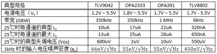 由于不同类型的运算放大器的 IQ 可能存在倍数级的差异,因此花时间选择合适的放大器是值得的。以下引用TI TLV9042、OPA2333、OPA391和TLV8802作比较。单纯从数字上的分析,对于需要最大功率效率的应用,TLV8802 将是一个很好的选择。