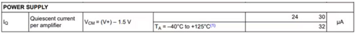 运算放大器电路的功耗由多种因素组成,分别是静态功率、运算放大器输出功率和负载功率。静态功率 (或简称PQuiescent) 是保持放大器开启所需的功率,数据表中一般以 IQ(静态电流)表示,例如下图中Texas Instruments OPA391规格书中的显示。