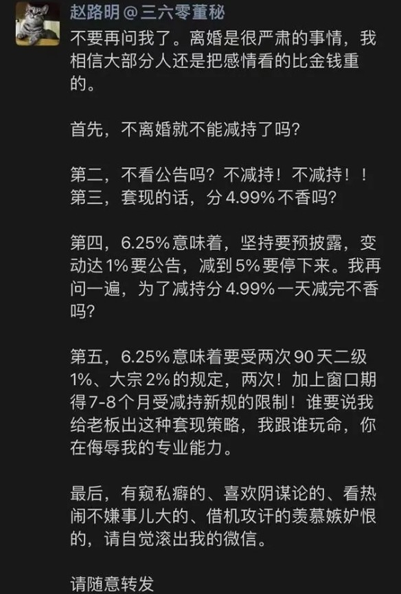 三六零董秘赵路明4日晚间在朋友圈力挺老板,并怒怼称:离婚是一件很严肃的事,谁要说我给老板出这种套现策略,我跟谁玩命,你在侮辱我的专业能力。如果为了套现,分4.99%不香吗?