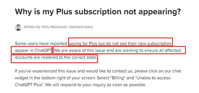 OpenAI:一些用户表示订阅的Plus版本并没有出现在ChatGPT中。我们已意识到此问题,正努力确保受影响的帐户恢复正常。