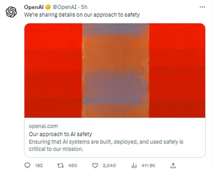值得注意的是,OpenAI发布的最新动态特意强调了AI安全,OpenAI表示,“确保安全地构建、部署和使用AI系统对我们的使命至关重要”,就在5个小时前,其社交平台官方账号转发了该消息,“我们正在分享有关安全方法的详细信息”。
