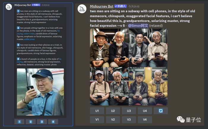 不过,直接用它给出的描述再生成图,会跟原图有些差别,比如设计美学博主 @Simon_阿文尝试的这个“地铁老人看手机”梗图: