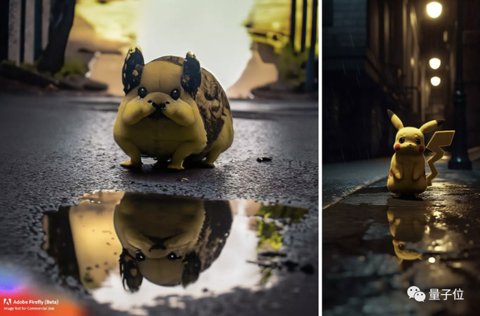 除去皮卡丘形象不说,还是 MidJourney 更能抓住氛围,Firefly 这次连昏暗的街道都表现得不到位。