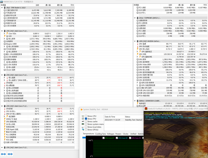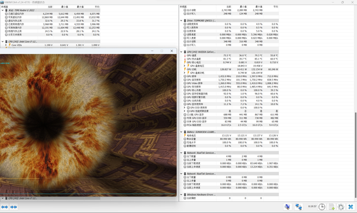 接下来我们同时运行以上两款软件,模拟最大的压力,运行 15 分钟的双烤。15 分钟后 CPU 稳定在 44W、78℃,GPU 稳定在 130W、80.7℃,显卡能全程保持满功耗,CPU 也运行在大约 45W 的标准功耗左右,整机性能释放大约 175W,表现很不错。