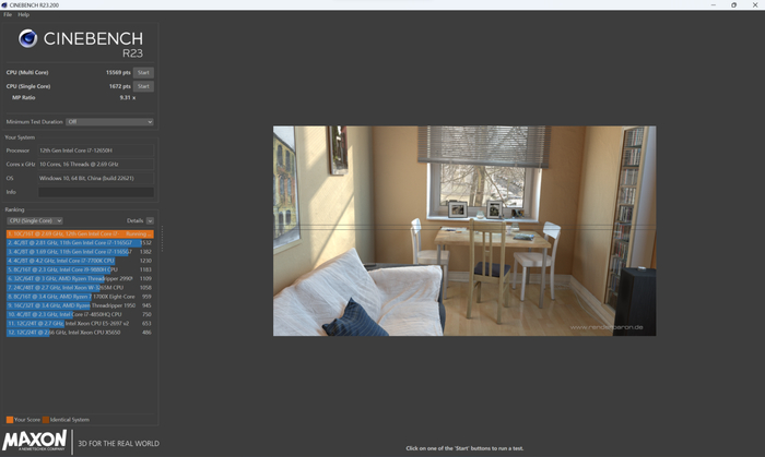 在代表 CPU 理论性能的在 R20 中,获得了单线程 641 分,多线程 6010 分的成绩。在 R23 中,则达到了单核 1672 分和多核 15569 分.可以说 i7-12650H 基本上是 i7 的单核性能、i5 的多核性能。确实很适合网游的处理器。