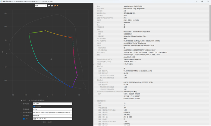 打开 B 面,是一块 2.5K 240Hz 的 IPS 电竞屏,支持 10 亿色彩显示。实测色彩覆盖达到了 96.3% 的 sRGB,色域容积为 97.4% 的 sRGB, 是一块不浓不淡,适合 Windows 下使用的屏幕。亮度也是高达 515nit,阳光下也能看得清。这样一块高分、高刷、高亮度的屏幕,即便在 2023 年也不落伍,在 2022 年更是降维打击。