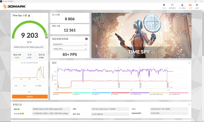 跑分方面 RTX 3060 Laptop GPU 完全能释放全部的性能,3DMark TimeSpy 的 GPU 理论分数达到了 8806 分,和下一代 RTX 4050 Laptop GPU 相差无几,不必担心性能不够用。