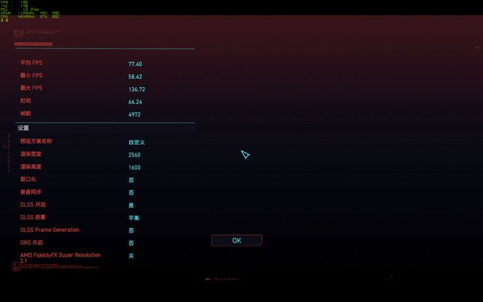 最后我们来看看压力最大的《赛博朋克 2077》,2.5K 高画质下开启平衡档 DLSS,可以达到平均 77 帧。只要不开光追,畅玩高画质还是没问题的。