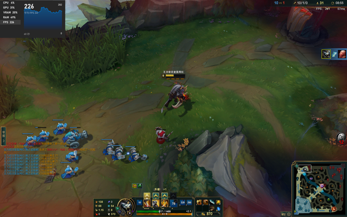 首先是电竞游戏,我们选取了《英雄联盟》、《CS:GO》、《绝地求生》、《永劫无间》和 4 款主流的电竞游戏进行测试。实测在《英雄联盟》中,对线时平均帧可以在 240 帧上下徘徊,是可以排满这块出彩的电竞屏的。