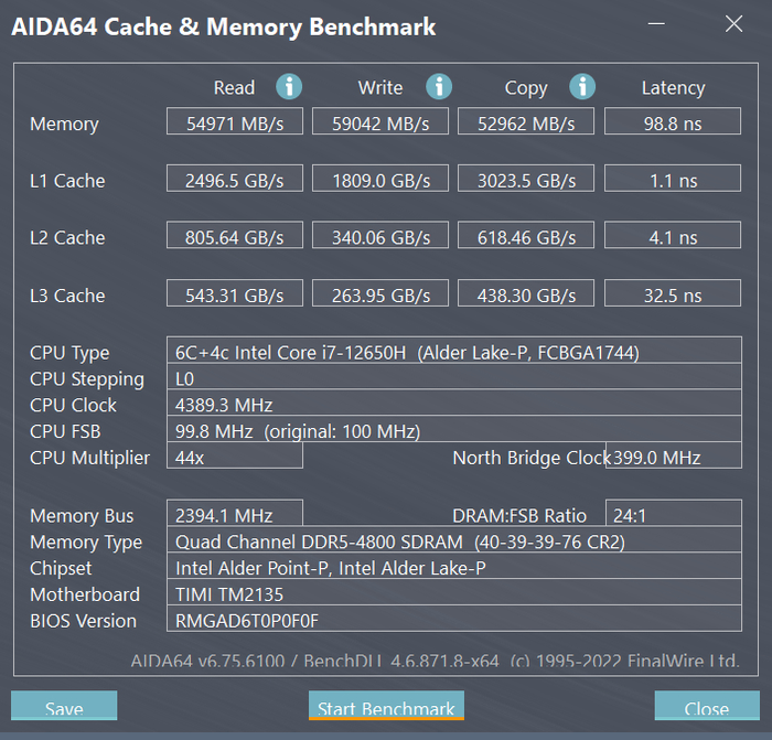 内存则是标准的 4800MHz 的 DDR5 笔记本内存,跑分也符合双通道 DDR5 笔记本内存的正常表现,在这个价位不可多得。